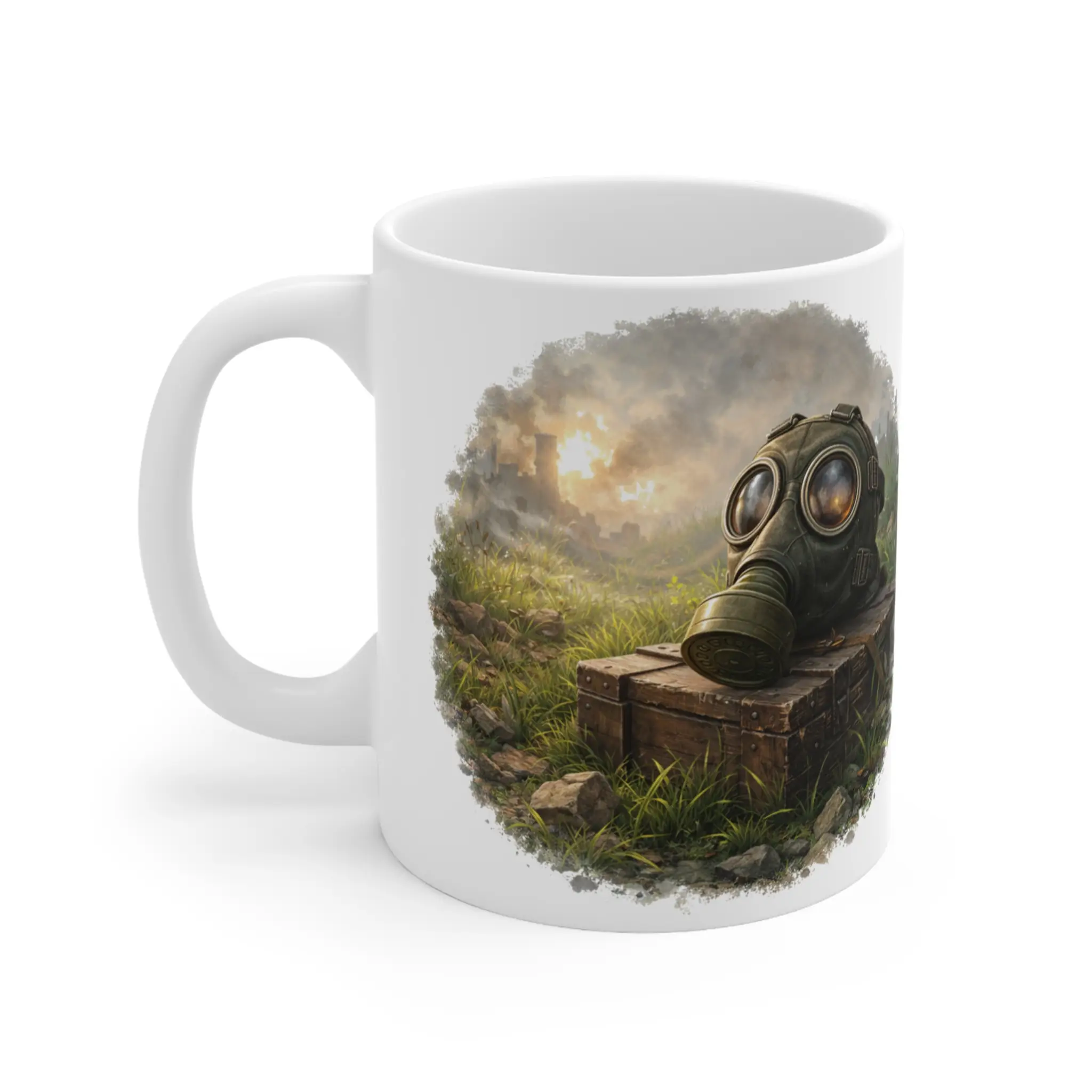 This striking gas mask mug features a calm WWII battlefield moment from the Ground Warfare collection by Mug Of War.