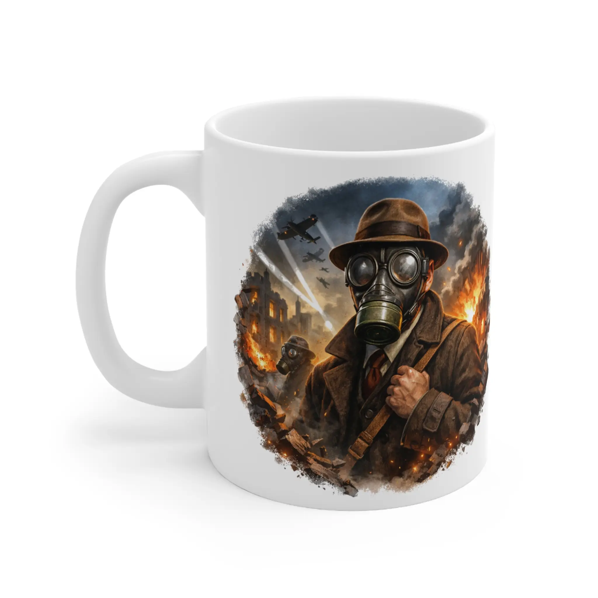 This striking gas mask mug features a dramatic WWII urban combat scene from the Ground Warfare collection by Mug Of War.