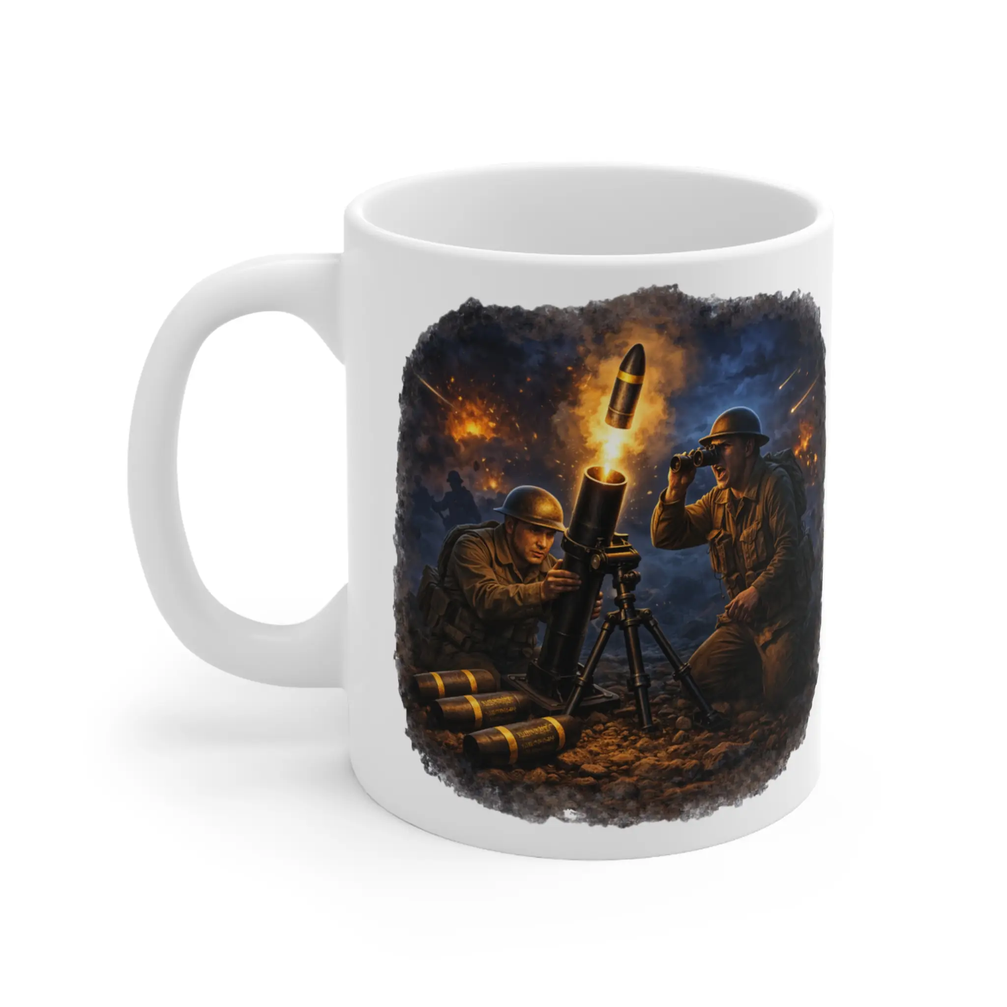 This powerful mortar mug showcases a dramatic night barrage scene from the Ground Warfare collection by Mug Of War.