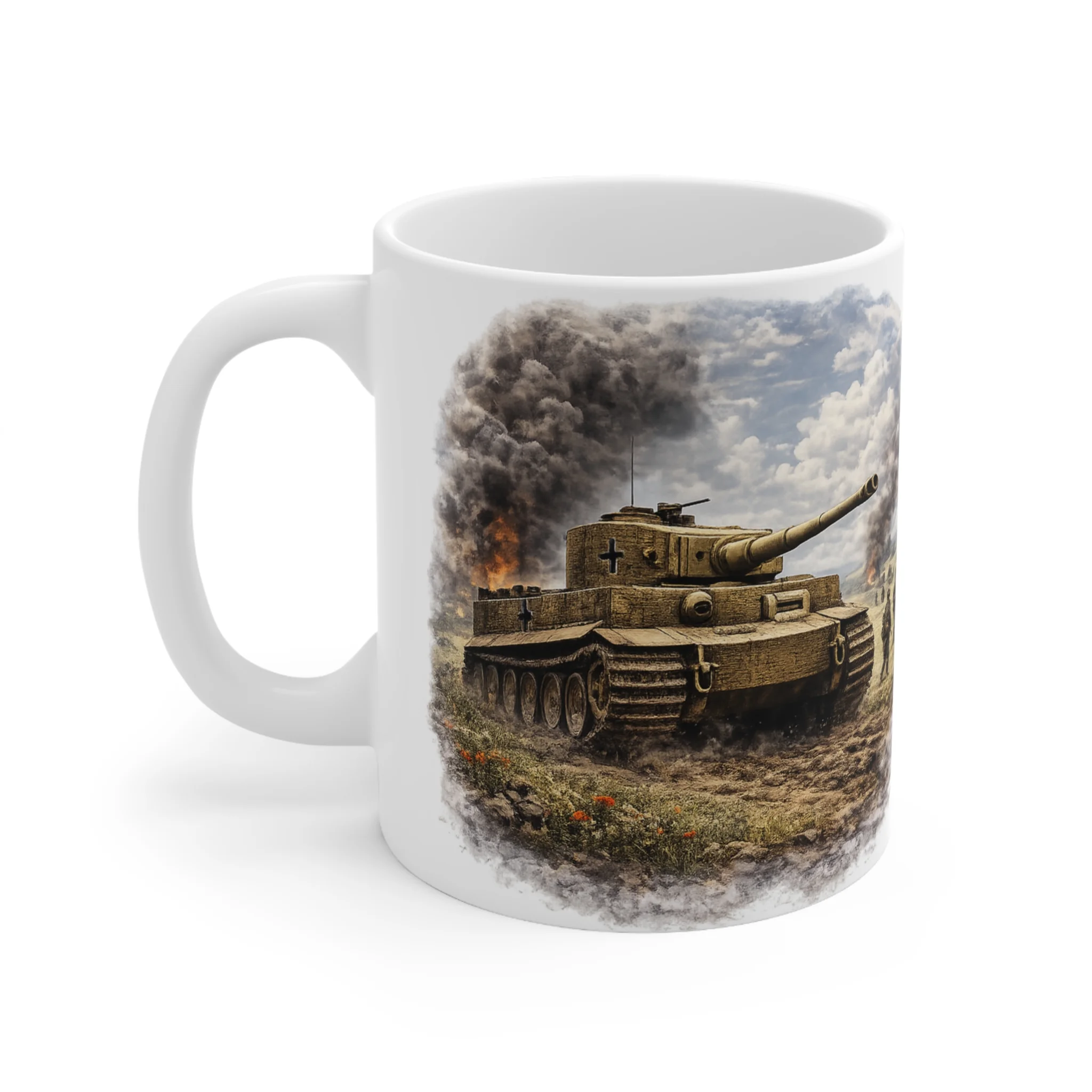 This striking Tiger I tank mug features a calm WWII armoured warfare scene from the Ground Warfare collection by Mug Of War. The artwork shows the legendary German Tiger I heavy tank moving across a rural battlefield landscape as smoke rises from distant fighting. The scene captures the tense quiet moments between engagements, as armoured units patrol contested ground during the brutal campaigns of the Second World War.