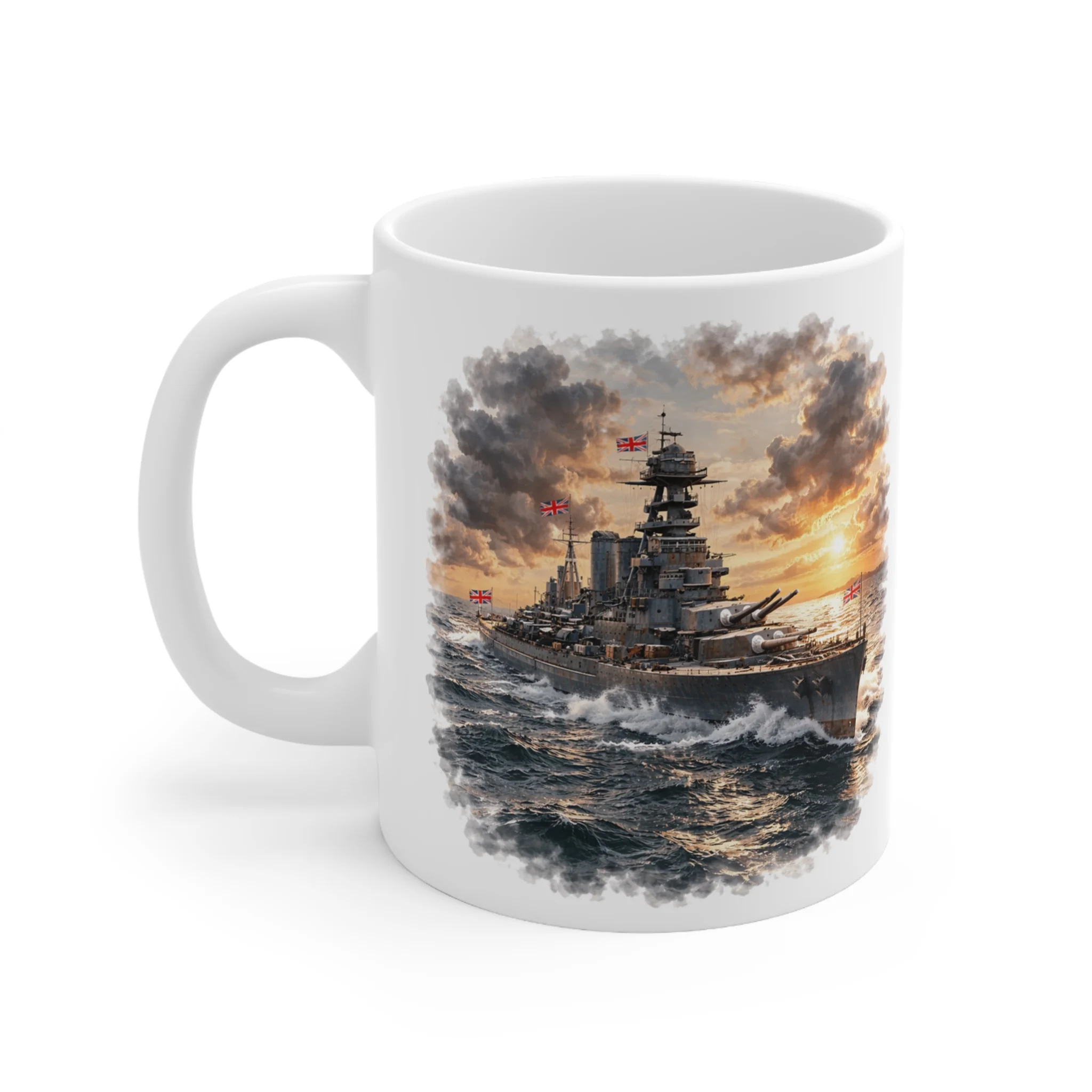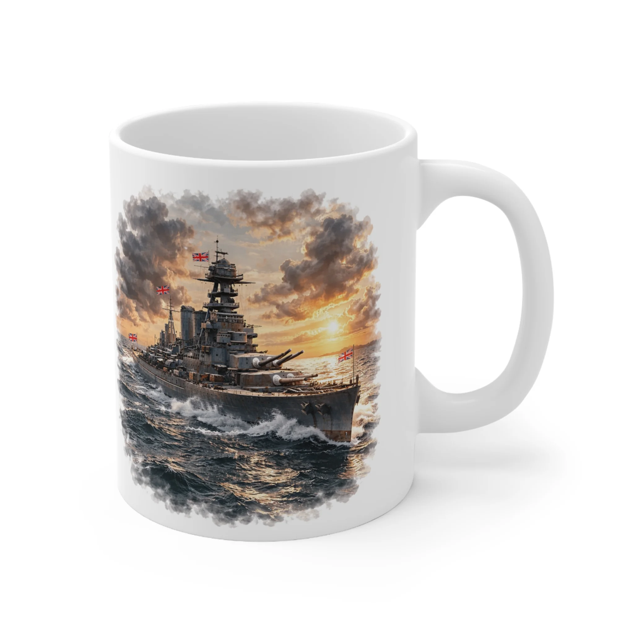 This striking hms hood mug features a powerful WWII naval scene from the Naval Warfare collection by Mug Of War.