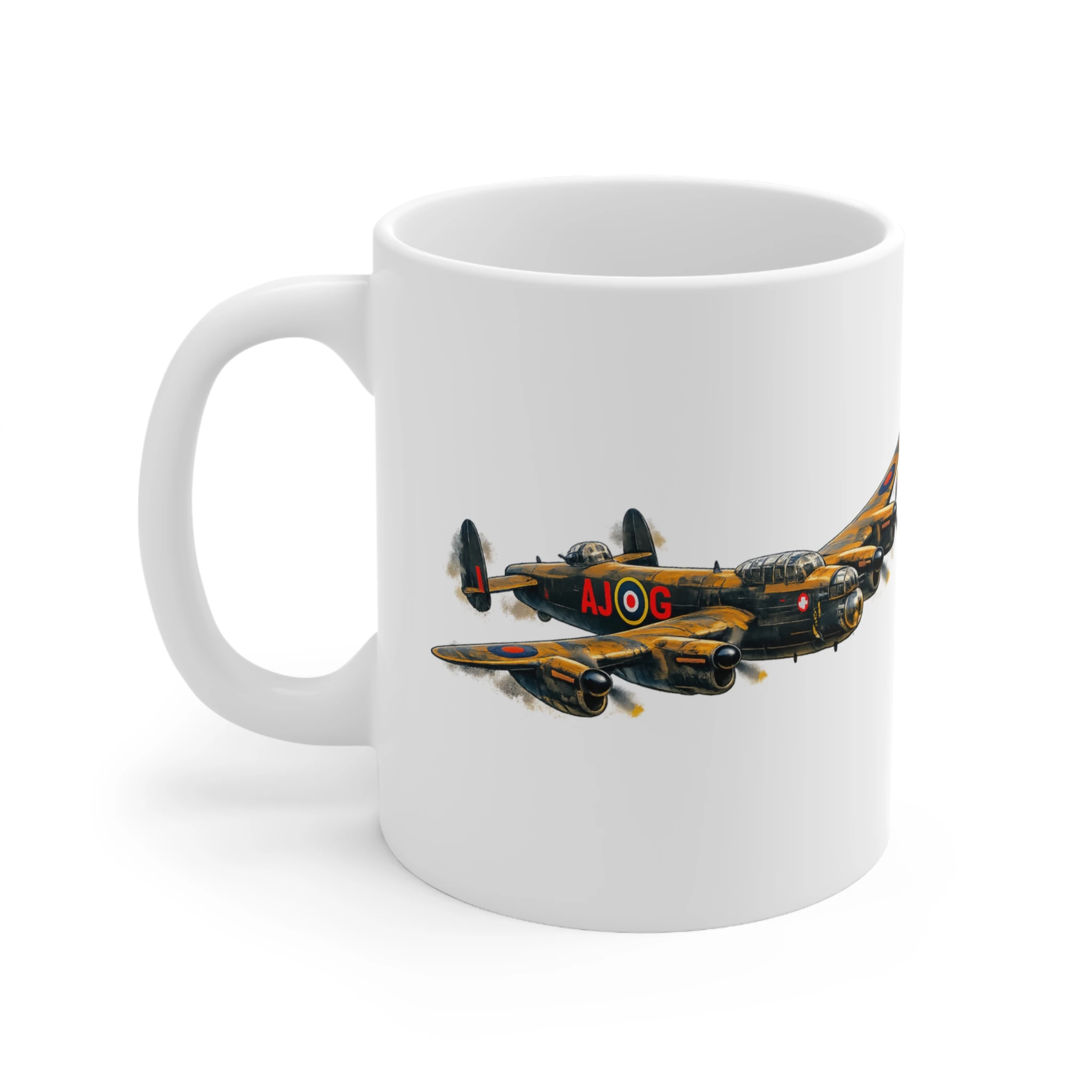 Featuring two Avro Lancaster bombers positioned on either side of the mug, this design showcases the iconic RAF heavy bomber in a clean aircraft cutout style. The legendary AJ-G squadron markings are clearly visible, highlighting the unmistakable shape and presence of one of the most famous bombers of the Second World War.