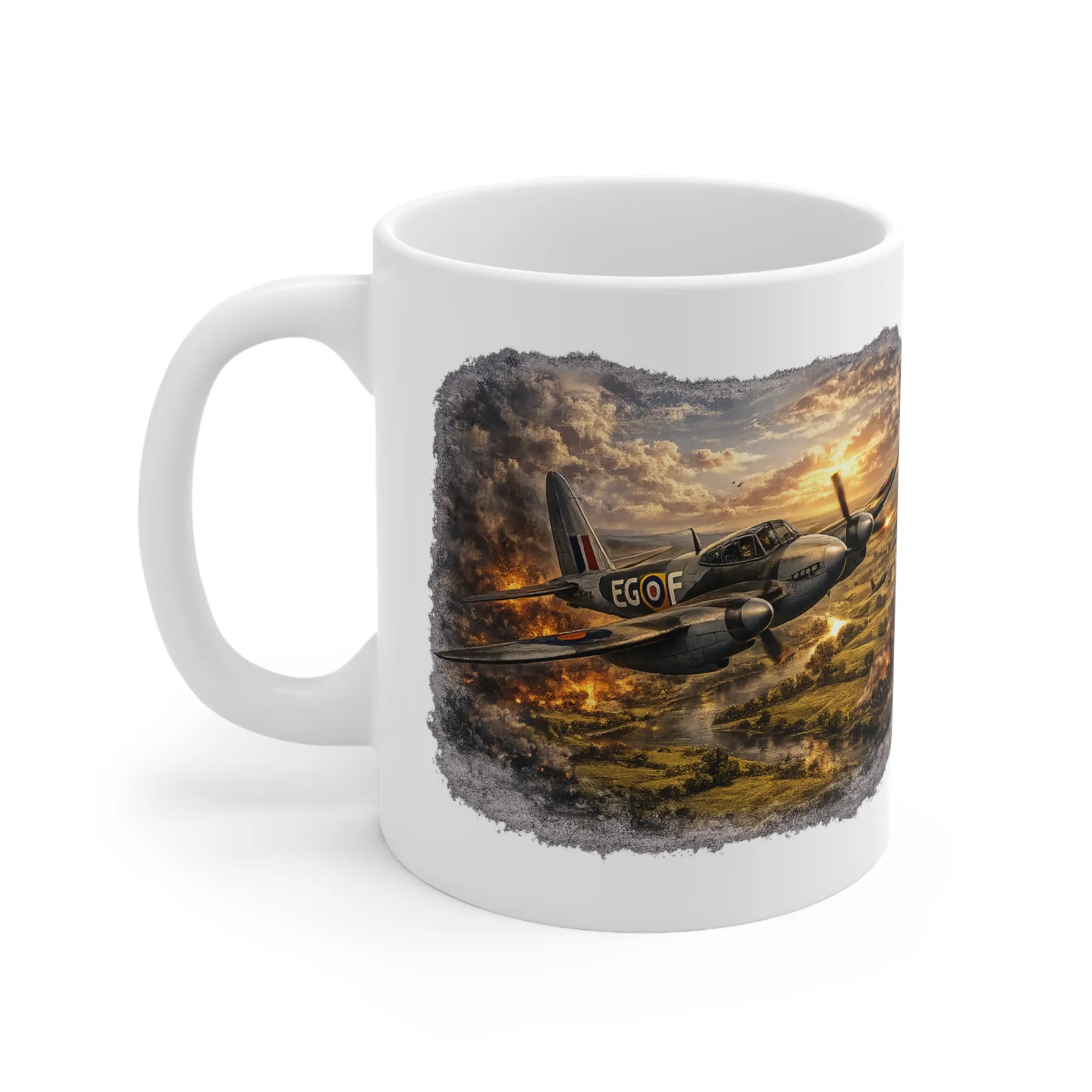 This dramatic Mosquito mug features a powerful WWII aviation scene from the RAF Legends collection by Mug Of War. Showcasing the legendary de Havilland Mosquito flying low over the countryside as explosions and smoke rise from a recently completed strike mission, this artwork captures the intensity and success of RAF operations during the Second World War.