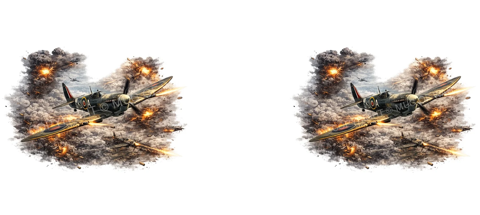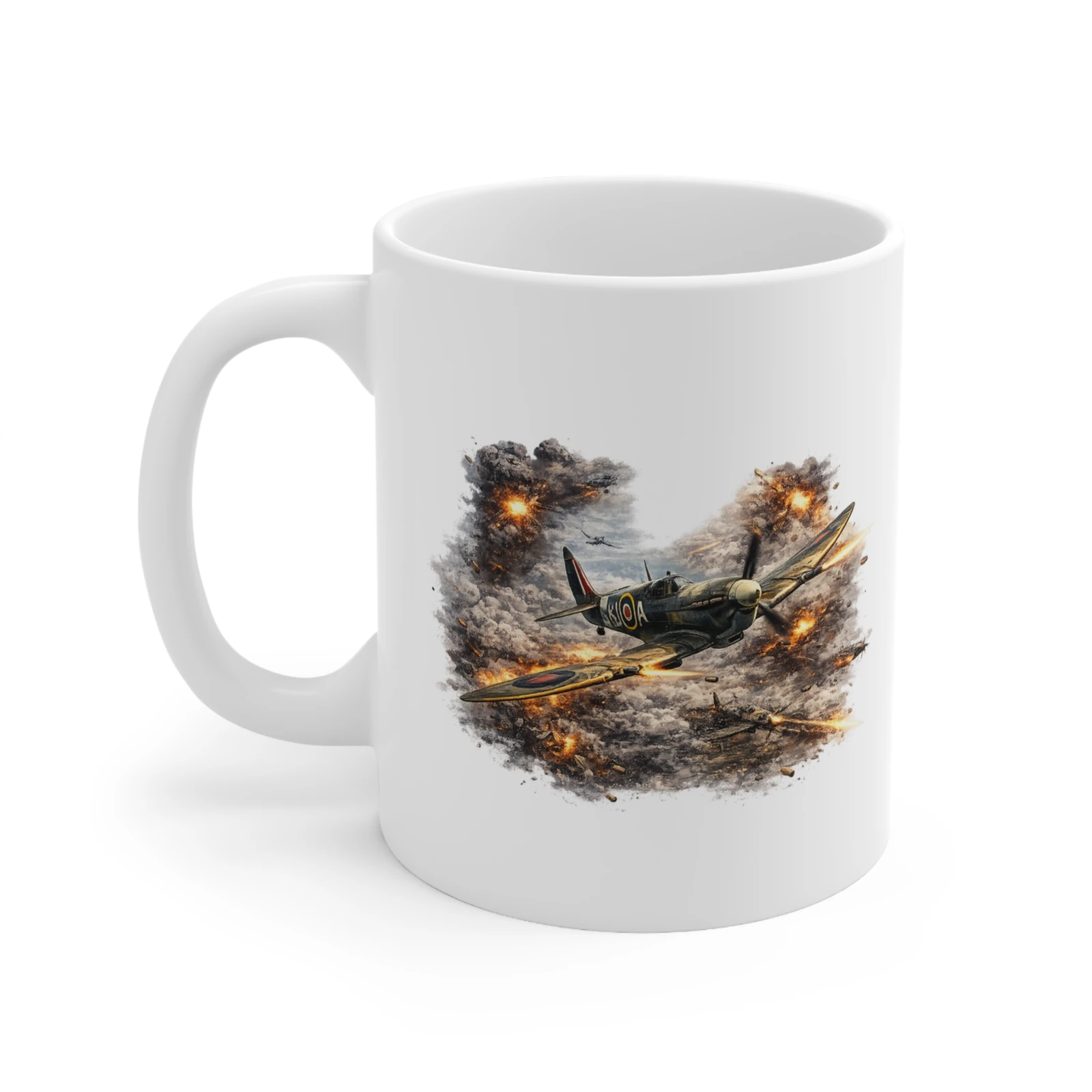 Featuring the legendary Supermarine Spitfire tearing through a sky filled with explosions and smoke, this design captures the chaos, courage, and raw power of aerial combat during the Second World War. The artwork highlights one of the most iconic fighter aircraft in history as it engages the enemy in a blazing dogfight high above the battlefield.