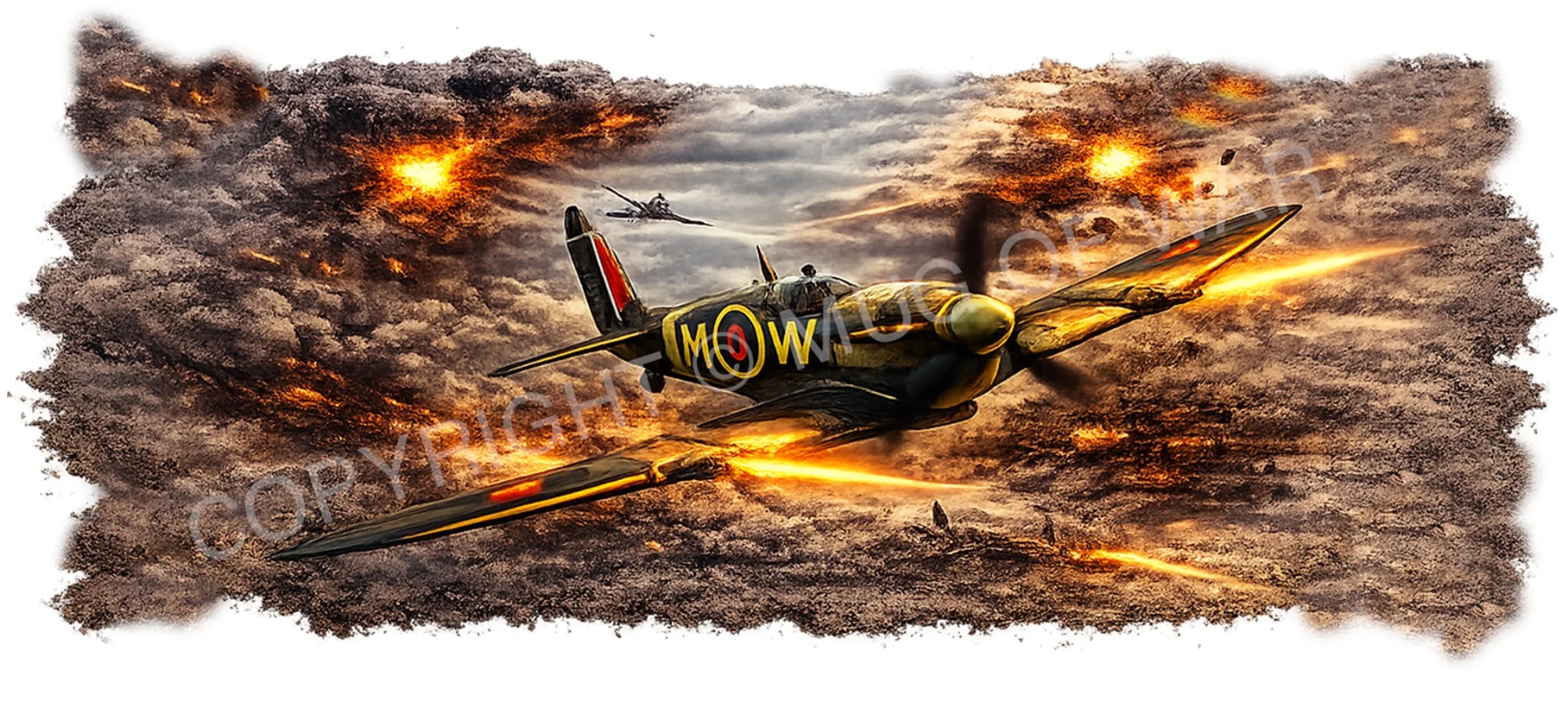 Featuring the legendary Supermarine Spitfire diving through a sky filled with explosions and tracer fire, this design captures the speed, aggression and power of wartime air combat. The artwork highlights the iconic British fighter aircraft as it roars through a dangerous low-level attack during one of history’s most intense aerial battles.