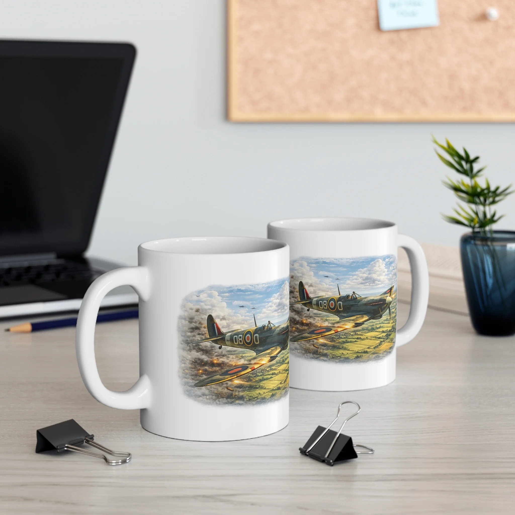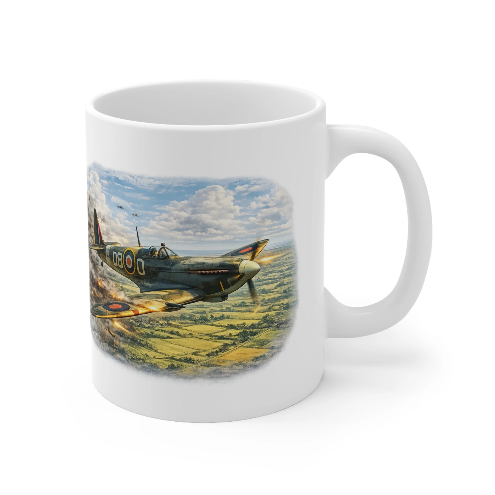 This striking spitfire mug features a dramatic WWII aviation scene from the RAF Legends collection by Mug Of War.
