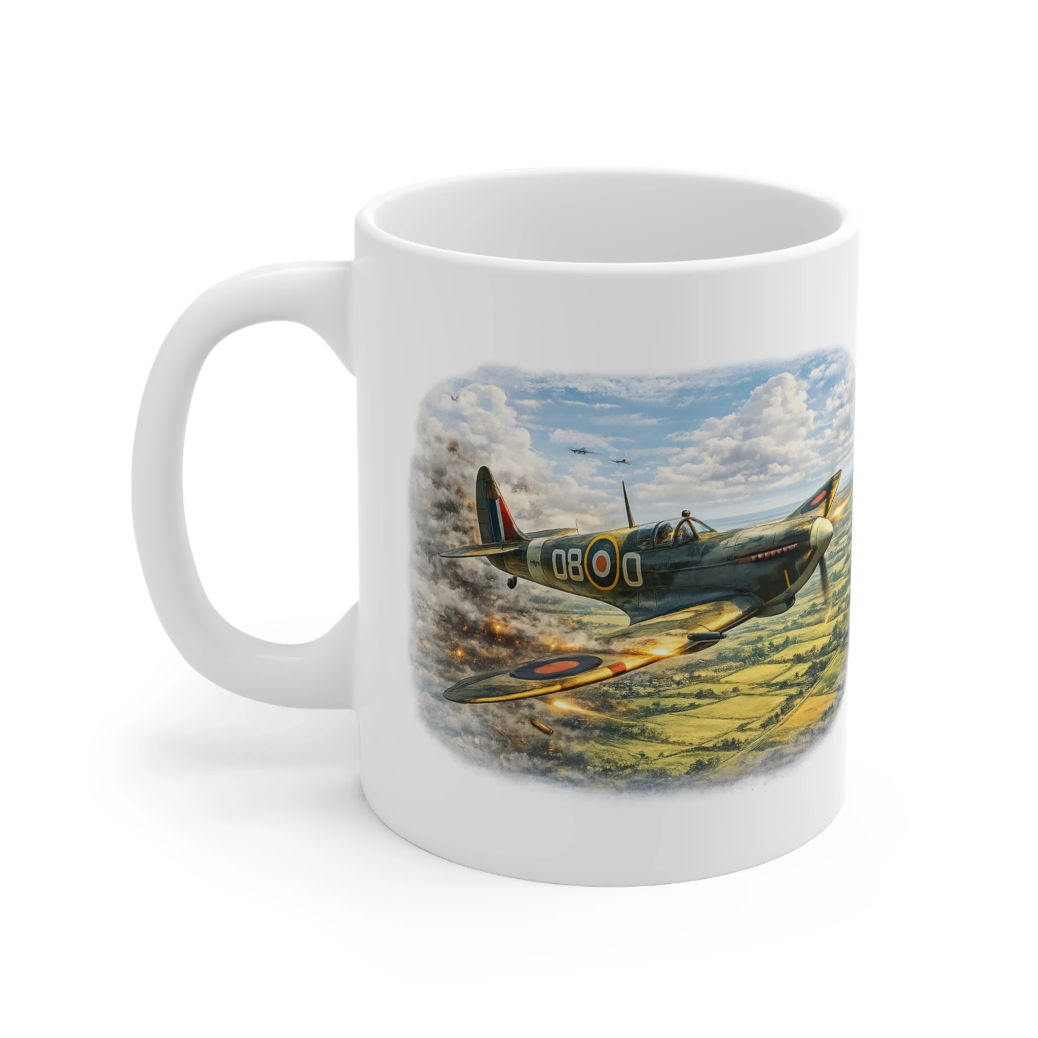 Featuring the legendary Supermarine Spitfire sweeping across the skies above the English countryside, this design captures the elegance, power and presence of one of the most iconic fighter aircraft of the Second World War. The artwork highlights the aircraft patrolling the landscape during wartime operations, representing the courage and determination of RAF pilots during the Battle of Britain.